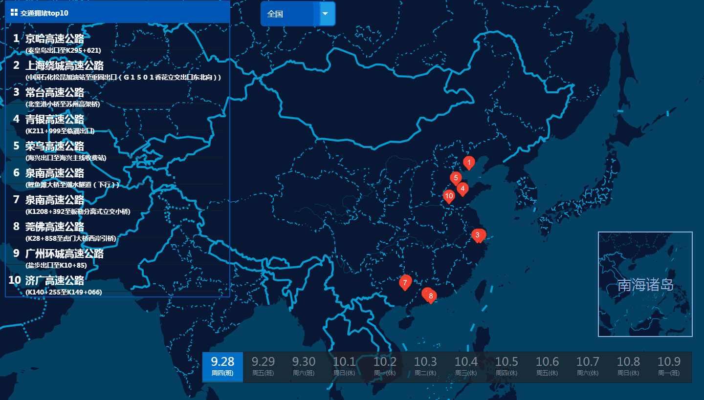 而9月28日至10月9日期间预测的十大拥堵路段中,10月1日的是沈海高速宝安收费站砸道桥至南通(南)出口、沪蓉高速苏家湾中桥至枣庄服务区-加油站、京沪高速璜塘出口至顾周中沟桥、广昆高速莲塘出口至K106+538、沪渝高速K166+068至梨花桥(右桥)、长深高速K1819+022至热水互通B砸道桥、长深高速羊田小桥2至K3529+315、沈海高速埔仔一桥至陆丰高速南加油站、宁洛高速十八河至中桥3右幅、京港澳高速元贝大桥至K2109+465。