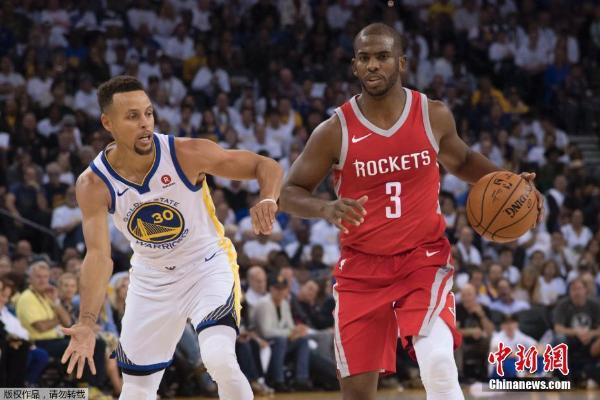 整场比赛,库里得到22分,汤普森命中4记三分球得到16分,杜兰特22分,而勇士队最大的亮点是新加盟的尼克·杨,他9投8中得到23分。 火箭一边,哈登得到27分10助攻,保罗4分11助攻,周琦并没有上演NBA首秀。图为库里追防保罗。