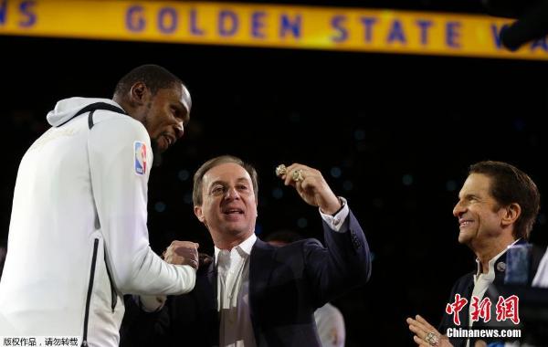 当日,也是勇士队的总冠军戒指颁发之夜,赛前的颁奖仪式上,杜兰特一直挂着微笑,多年的冠军梦想在这一刻算是正式得到了回报。从老板手中领过总冠军戒指时,喜不自禁的杜兰特低着头看了又看,先把戒指戴在左手的无名指上,随后又很快换到右手的无名指上,享受着这样的成就时刻。