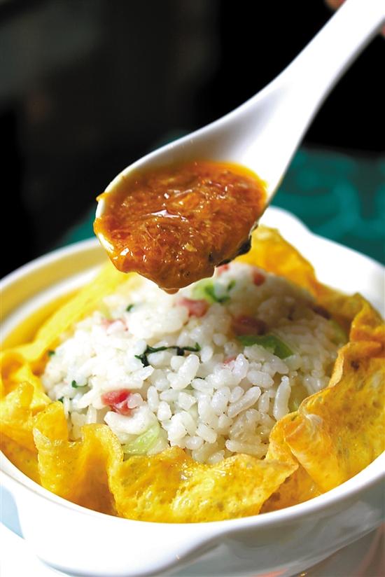 最考师傅手艺的是一道“蟹粉捞饭”,大米和咸肉共煲后,混合上海青炒香,加蛋皮裹起来。最后蟹粉浇在米饭上,很是开胃。炒蟹粉最难的是,要将固态的蟹粉做成黏稠状。师傅采用的方法,是在炒蟹黄的过程中加入黄酒调浓,而为了辟除蟹黄的腥味,还加入了姜葱和鸡汤调味。一勺黏稠的蟹黄酱,浇在清香的炒饭上,再配上特别调制的白醋,味道非常甘香。