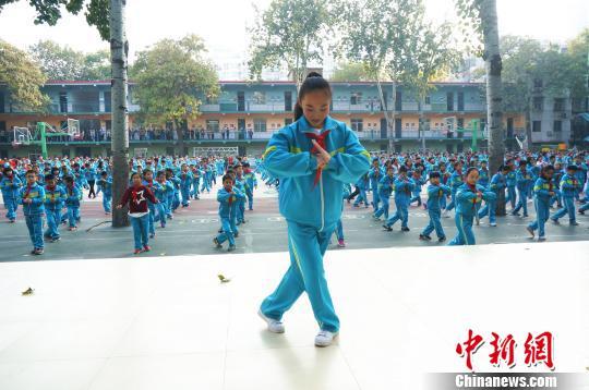 中新网郑州11月7日电(记者 韩章云)亮相、涮腰、腕花小云手、飞天十三响……11月6日下午,在郑州市文化路第二小学,小学生们在大课间做起了戏曲广播体操,这些戏曲中的经典动作孩子们一招一式学的有模有样,兴趣浓厚。