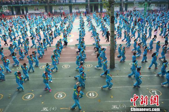 图为小学生们集体做戏曲体操。 韩章云 摄