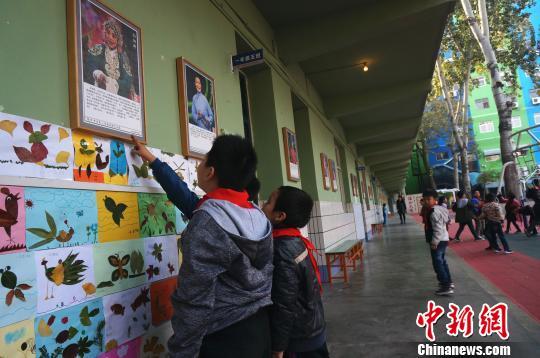图为学校教学楼走廊上悬挂的戏曲名家画像。 韩章云 摄
