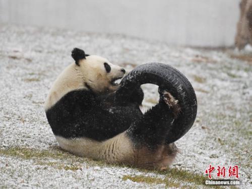 资料图:大熊猫梦梦在玩轮胎。中新社记者 张瑶 摄