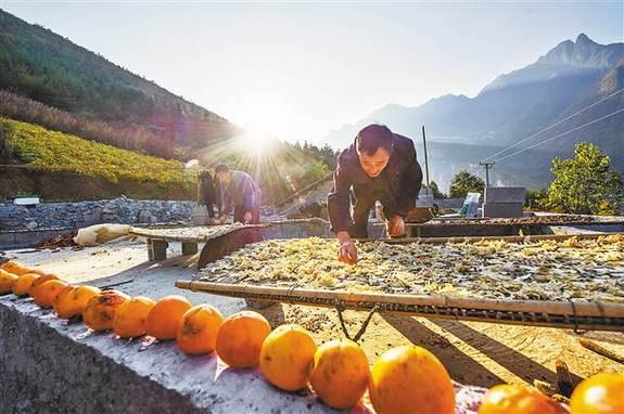 11月8日,兰英村周家坪,村民正在自家房顶翻晒萝卜片。