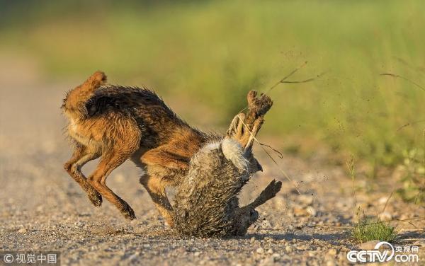 2017年11月29日,立陶宛,一位意大利商人在穿越当地Mirabilis森林时拍到了这一惊险的生死时刻,一只狐狸正在追捕一群野兔,在一只野兔被捉到后,发生了戏剧性的反转,野兔用尽全身力量,竟然赶走了捕食者。来源:视觉中国