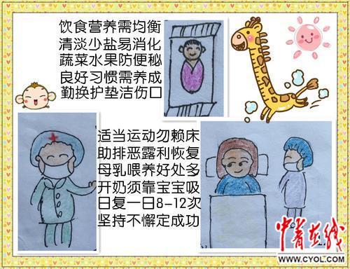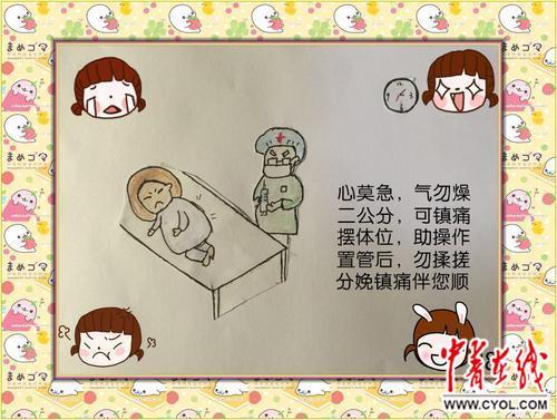 进入麻醉室,则须“心莫急,气勿躁;二公分,可镇痛;摆体位,助操作;置管后,勿揉搓;分娩镇痛伴您顺”。一妇婴西院产科护士长刘宏解释,漫画的意思是,当宫口开至2公分以上,可以按产妇要求予以分娩镇痛,通知麻醉师实施镇痛;麻醉体位是产妇用双手抱住两大腿膝盖,头尽可能贴近胸口,像虾一样将背部弓起挺出,保持姿势让麻醉师实施麻醉操作;麻醉后,背部有软性连接管予以敷料黏贴,不要来回摩擦背部,防止导管脱出。