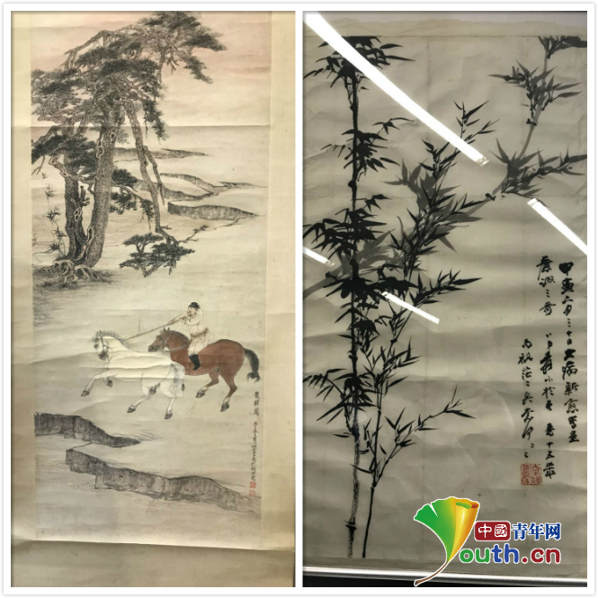 左图为张善子、张大千共同绘制的名画《双骥图》,右图为张大千名画《墨竹图》。陈俊成 摄