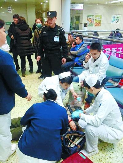 门诊护士郝伟、陈孟云当时距离这位女患者最近。她们发现患者突然倒地后,反应迅速,立即上前查看情况,为她测量血压,并进行了心肺复苏。训练有素的二人一边抢救患者,一边通知承担院内急诊功能的胸内二科。由于抢救及时,患者很快清醒了。随后,门诊护士协助胸内二科的医务人员将这位患者送到了病房。胸内二科及时通知了患者家属,并处理了患者晕倒后发生的口、耳部的皮外伤口。经过检查发现,患者血压偏低,医务人员随后协助安排救护车将患者转诊至综合医院。