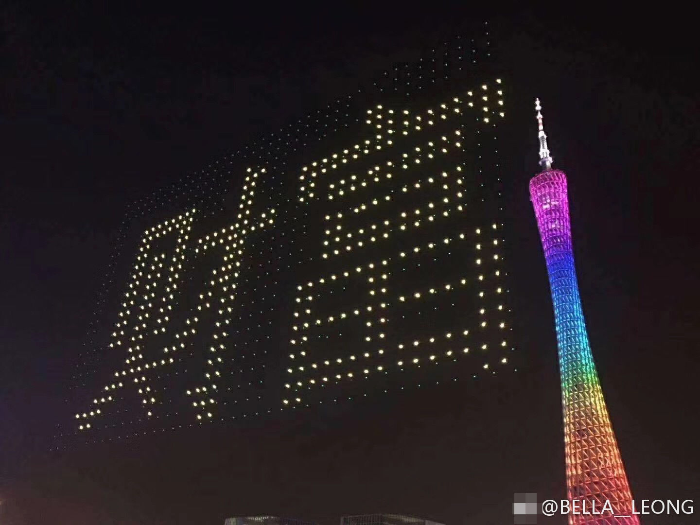 据悉,这是继2017年元宵节广州在海心沙创造的1000架无人机表演破吉尼斯世界纪录之后,带来的数量更多的无人机编队飞行表演。图为无人机拼凑“财富”二字。