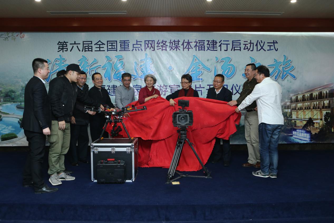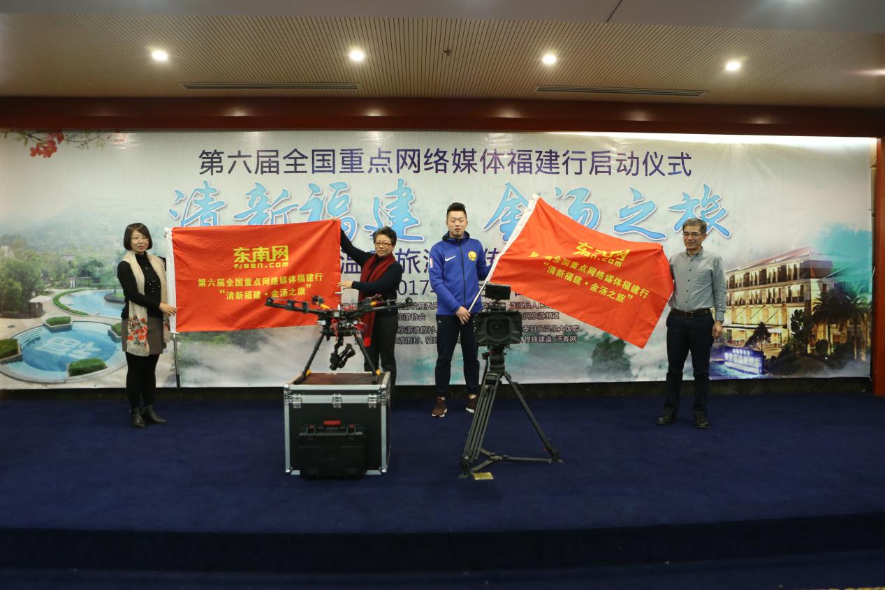 在启动仪式上,福建省旅游发展委员会副主任吴立官、福建日报社(报业集团)党组成员、副总编辑任君翔分别为采访团授旗,宣布第六届全国重点网络媒体福建行“清新福建·金汤之旅”正式启动。