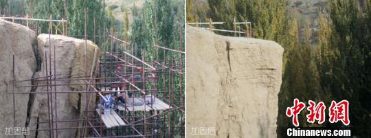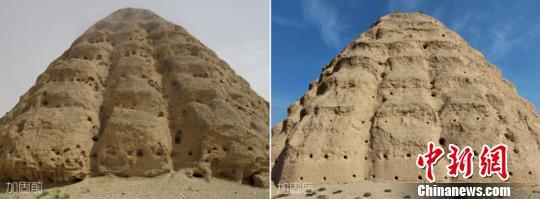 资料图。图为“干旱环境下土遗址保护关键技术研发与应用”项目应用于土遗址保护前后对比图。敦煌研究院供图