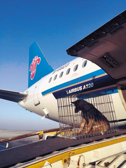 1月24日,南航北方分公司CZ6491(沈阳—兰州)航班迎来了一批特殊的“旅客”——17只训练有素的警犬。这批警犬来自某警犬训练基地,品种是德国黑贝,均为1岁多,刚刚学成出师,即将前往兰州服役。
