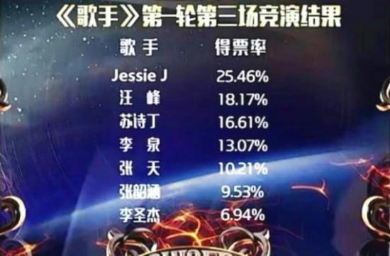 《歌手2》三期,Jessie J三连冠,创造了《歌手》舞台上第一个三连冠记录。苏诗丁将第三名收入囊中,在《歌手》舞台上站稳脚跟。补位歌手李泉位列第四,汪峰继续稳定发挥拿下第二,上周第二的张韶涵再遭滑铁卢跌至第六,黑马张天第五,三期出场第一的李圣杰排名最末,遗憾被淘汰。
