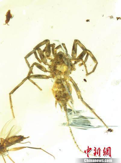 中新网南京2月6日电 (杨颜慈)由中国科学院南京地质古生物研究所研究员王博和黄迪颖分别领衔的两个国际科研团队,通过研究保存于1亿年前缅甸琥珀中的“怪物蜘蛛”——应氏奇美拉蛛,证实蜘蛛古老祖先存在长长的尾巴,填补了蜘蛛起源的关键环节。