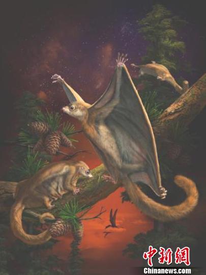 图为侏罗纪滑翔哺乳形类动物——似叉骨祖翼兽生态复原图。赵闯 制图