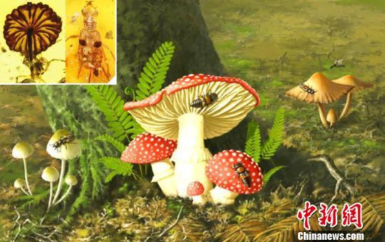 白垩纪中期巨须隐翅虫与蘑菇的生态复原图。中国科学院南京地质古生物研究所 制图
