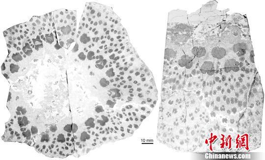 图为新疆塔城地区晚泥盆世枝蕨类植物Xinicaulis 茎干横切面。左图为一个较小树干的完整横切面,右图为一个较大树干的局部。中国科学院南京地质古生物研究所 制图