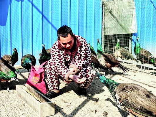 阳光下,35岁的张望开摊开手中的饲料,引来孔雀啄食。看着这些美丽的精灵,他喜不自禁。