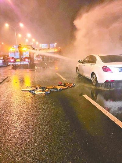 洒水车对着起火轿车车头喷水 通讯员陈静 鲁贤芳 供图