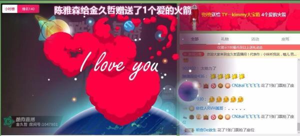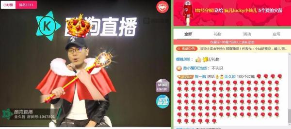在金久哲直播的过程中,他的同门师兄贺一航、师姐杨梓文祺也都齐齐来捧场,两人更是争相给金久哲撒起了玫瑰花雨。师兄师姐的到来也让金久哲惊喜不已,他先是和粉丝们隆重介绍了他的好师兄贺一航,然后又唱了一首他与杨梓文祺对唱过的《等风等雨我等你》。贺一航和杨梓文祺来过之后,另一位酷狗直播的重量级歌手、金久哲的好哥们陈雅森,也以一枚“爱的火箭”从天而降,为金久哲送上了新歌首唱会的祝福。