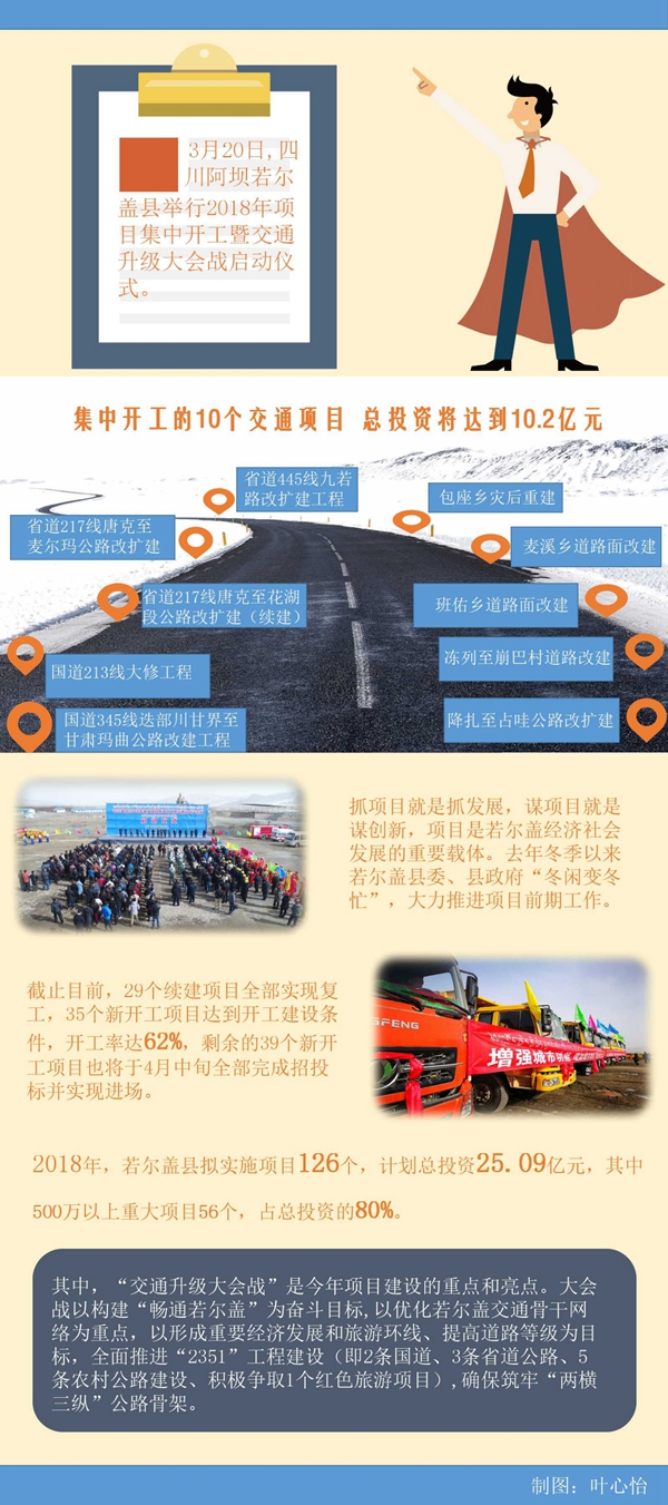 中国青年网成都3月22日电(隆敏 叶心怡)3月20日,四川阿坝若尔盖县集中开工的10个交通项目,总投资将达到10.2亿元。该县交通局和施工单位负责人表示,高原的项目施工的黄金期只有200来天,要求若尔盖县各级各部门将相互协调、密切配合,实现“当年设计、当年施工、当年完工”。