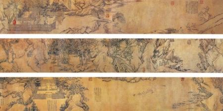 作品介绍:这幅画是据苏轼的名篇《赤壁赋》绘制而成,可视为一件山水人物作品。画卷依原赋叙述的顺序次第展开,将赋文氛围若干段移录于画面上。每段描绘一个情节,而全图首尾相连,并无间隔,同一人物在图中反复出现,是所谓“异时同图”的方法。