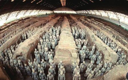 作品介绍:1974年在陕西省临潼县西杨村发现一处地下建筑及陶俑,其位于秦始皇陵园东侧1000米处。这件事震动了世界,这就是被称为“世界第八大奇迹”的秦陵兵马俑。秦兵马俑场面宏大,威风凛凛,队列整齐,展现了秦军的编制、武器的装备和古代战争的阵法。秦兵马俑皆仿真人、真马制成。
