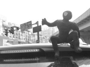 在半个小时的执法中,交警共拦下了4辆车。车顶上粘贴着“蜘蛛侠”、“豌豆尖”等玩偶。司机们都表示,在车顶粘贴玩偶只是为了“好耍”“看到别人粘了,好玩”。
