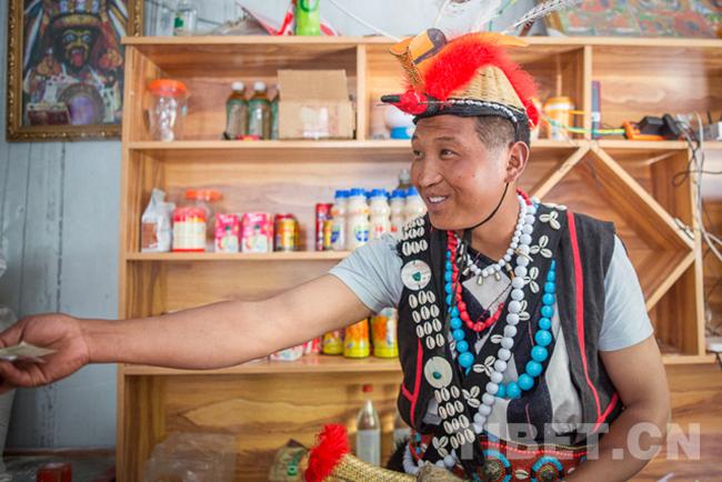 对于扎西顿珠来说,儿子的成长是他关心和欣慰的。另一件扎西顿珠关心的事是他的小生意盈利如何。扎西顿珠不仅是名舞者,还是一个家庭旅馆、商店、饭店的老板。2014年斗玉珞巴民族乡投入大量资金改善交通、水利、通信等基础设施,建设了斗玉珞巴民族乡生态文明小康示范村。扎西顿珠家分到了一幢250多平米的二层小楼。家里只有四口人,扎西顿珠觉得房子空着有些浪费,就开起了家庭旅馆。现在家庭旅馆里住进了一些修路工人。来自四川邛崃的张先生住在扎西顿珠家一楼,虽语言不通,但刚搬进来两个月的他和工友们早已同扎西顿珠熟络起来。
