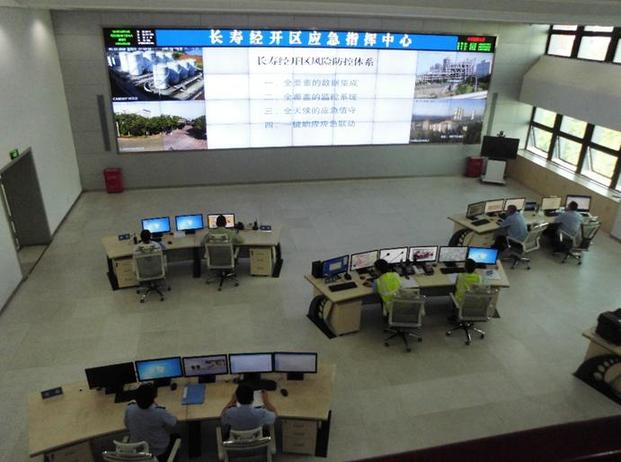 在长寿经开区应急指挥中心,记者了解到该中心已经建成了一套包括接警、成立指挥部、警戒疏散、应急抢险、医疗救援在内的完备的污染灾害应急响应系统。大厅内一整面墙壁上都投放着环保检测综合管理平台的大屏幕,可以实时观测各企业的排污情况。且该管理平台建有所有企业的基础信息数据库,方便随时调阅。屏幕前有工作人员全天候应急值守,以最大程度地提高应急处理反应速度。