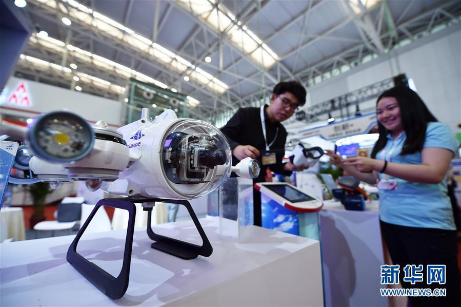 5月17日,观众在天津梅江会展中心智能科技展上参观深之蓝的水下机器人。新华社记者 李然 摄