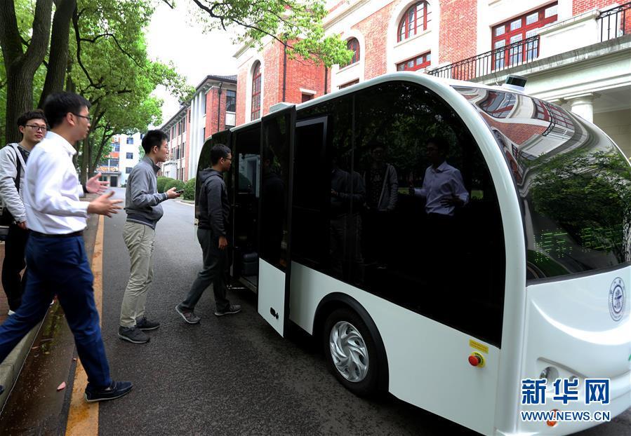 5月8日,乘客登上在上海交通大学校园内进行实验性运行的无人驾驶小巴。新华社记者 刘颖 摄