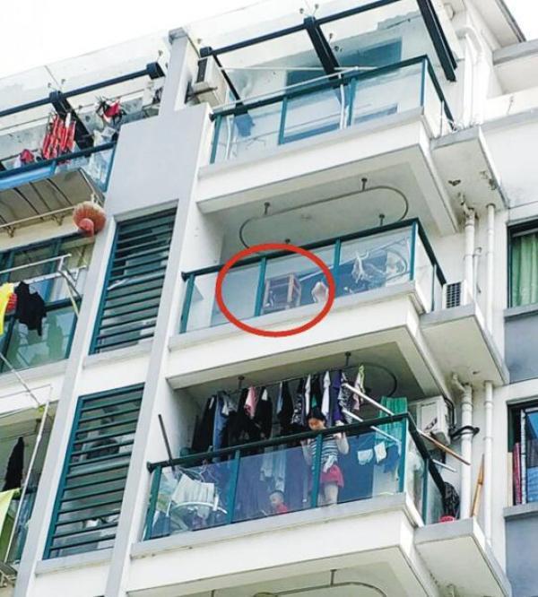 从居民提供的照片上看,女孩应该是从五楼阳台上掉下来的,该阳台有玻璃护栏,阳台上还放置了两把叠起来的方凳。“女孩可能是站上叠起来的方凳去晾晒棉被,不慎掉落下来,她先砸在二楼的雨棚上,然后又落地。巧的是,晾晒的棉被也一同掉下来,并幸运地成了女孩的‘垫背’。”采访时,小区居民推测说。