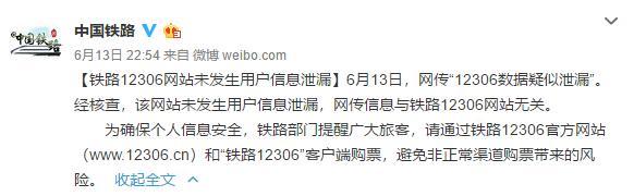 【真相】6月13日晚,中国铁路总公司在官方微博“中国铁路”上辟谣,表示铁路12306网站未发生用户信息泄漏,网传信息与铁路12306网站无关。【详细】
