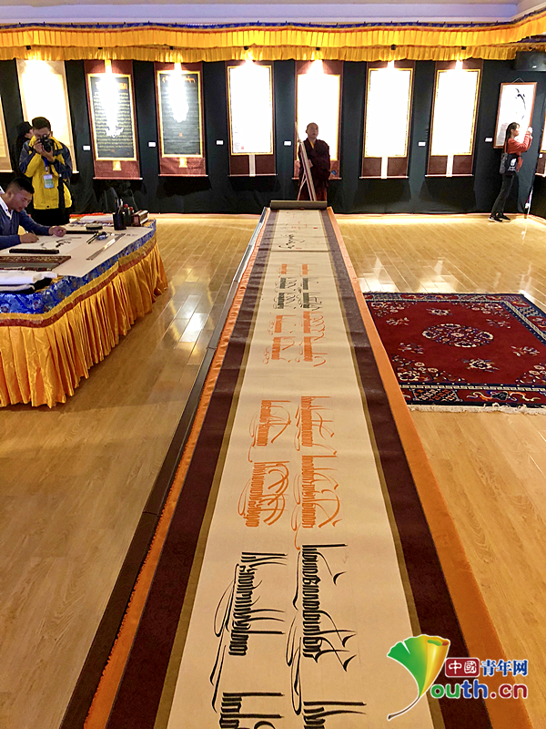 走进文化厅,一副仓央嘉措诗歌藏文书法百米长卷静置于桌面,在幽暗柔和的灯光下,显得神秘而庄严、灵动而质朴,恍然有隔世之美。昂旺曲批介绍,厅内展览的作品创作了一年多的时间,而该百米长卷也是首次对外展出。