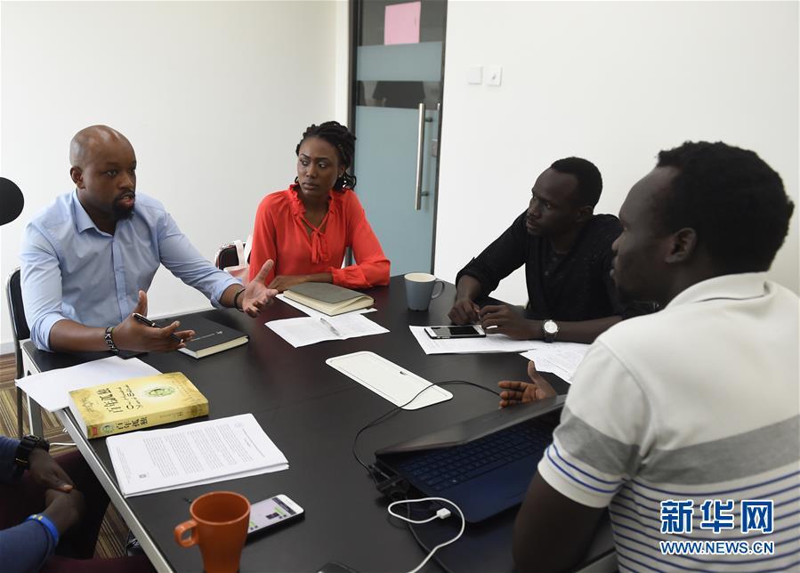 马希阳(左二)在和其他的国际创业团队交流(8月17日摄)。据介绍,在中关村一带一路产业促进会牵头组织下,“藤蔓国际双创空间”于2018年6月正式启动。已有20个来自加纳、津巴布韦等的国际创业团队入驻。 新华社记者 罗晓光 摄