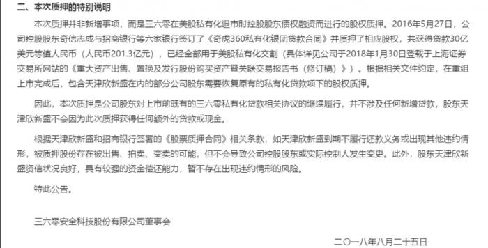 今年8月25日,三六零在一份“关于股东天津欣新盛股权投资合伙企业(有限合伙)股份质押的公告”中披露,天津欣新盛该次质押并非新增事项,仅为对上市前既有的三六零私有化贷款相关协议的继续履行,不涉及任何新增贷款或补充质押。同时明确,天津欣新盛不会因为此次质押获得任何额外的贷款或现金。