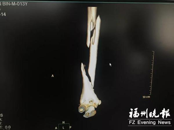 “送来我们医院的时候,他的右臂肿胀、畸形,局部明显压痛,活动受限,而且大拇指不会动了。”福州市二医院小儿骨科黄殿华医生介绍,片子显示,孩子“右肱骨干两处螺旋形骨折”“右桡神经损伤”,“也就是说,他的右上臂骨头断成了三节。”