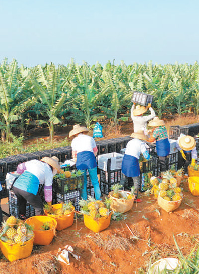 广东湛江市徐闻县盛产菠萝,种植面积达35万亩,年产量近50万吨。春节临近,菠萝开始大量上市。图为村民在田间将菠萝打包装车,准备销往全国各地。罗艾桦 陈北跑摄影报道