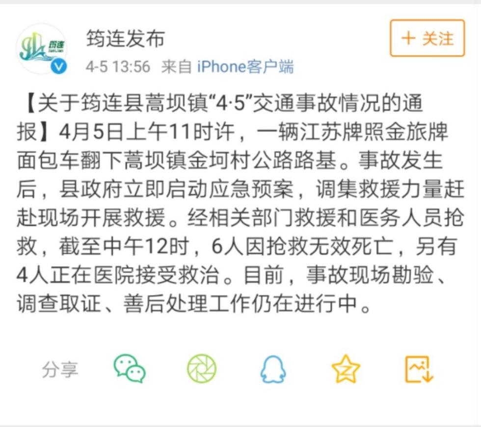 四川省宜宾市筠连县人民政府官方微博消息,4月5日上午11时许,一辆江苏牌照金旅牌面包车翻下蒿坝镇金坷村公路路基。