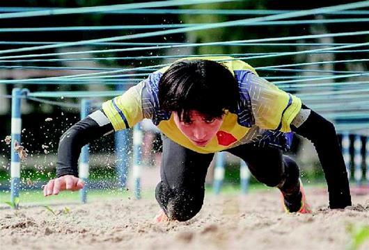 图为:空军五项队队员王佳在进行障碍跑训练。(资料图片)