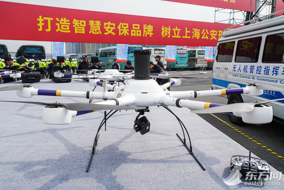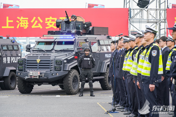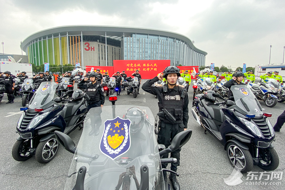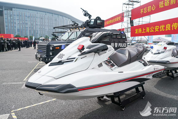 在誓师大会现场,上海警方公开展示了本届进博会安保工作的主要装备,除警用直升机、装甲车、水泡车等传统安保装备外,FC1800B--水上摩托艇、警用六旋翼无人机、穿戴式智能警务终端、倒三轮摩托车等一批新型精良装备将于本届进博会上首次使用。