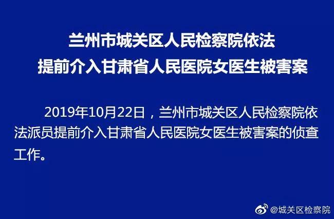 10月23日,甘肃省兰州市城关区检察院官方微博发布消息,兰州市城关区检察院依法提前介入甘肃省人民医院女医生被害案。