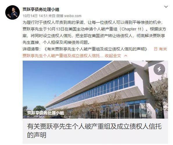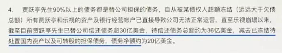 10月14日,贾跃亭债务处理小组发表《声明》,称“贾跃亭先生90%以上的债务都是替公司担保的债务”“截至目前,贾跃亭先生已替公司偿还债务超30亿美金, 待偿还债务总额约为36亿美金,减去已冻结待处置国内资产以及可转股的担保债务,债务净额约为20亿美金。”