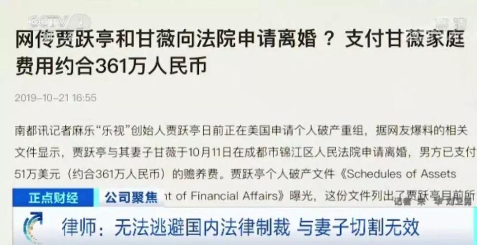 金焰:另外就是贾跃亭和他太太,申请在成都进行一个诉讼离婚,我们国家对于离婚的这类债务,其实要进行甄别的,如果是夫妻延续期间的债务,其实还是应该偿还的,并不是以婚姻终结,作为一个追偿或者不追偿的目标。