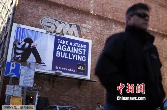 资料图:美国波斯顿市区,一名行人路过宣传反欺凌的广告牌。
