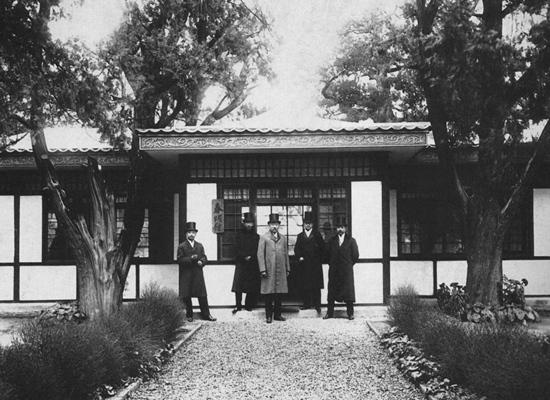 1914年,中央公园(北京中山公园前身——记者注)董事朱启钤(右一)等人在园内新建成的春明馆前留影。这一年的10月,由明清“社稷坛”改建成的中央公园,正式对公众开放。“旧影志工作室”供图