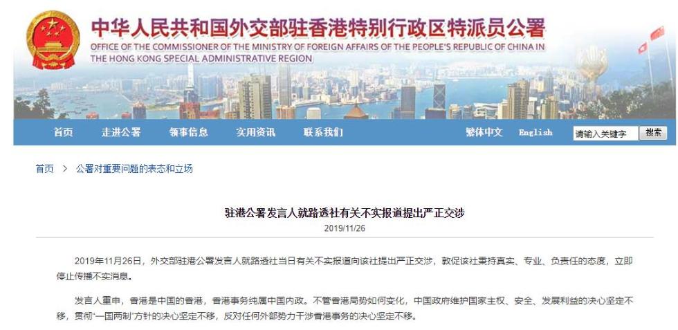 2019年11月26日,外交部驻港公署发言人就路透社当日有关不实报道向该社提出严正交涉,敦促该社秉持真实、专业、负责任的态度,立即停止传播不实消息。