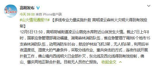12月5日13时50分,佛山市高明荷城街道凌云山荫岗水库附近山体发生火情。截止7日上午8时,国家应急管理部调动福建、湖南森林消防队伍,广东省应急管理厅调剂6个地市15支森林消防队伍,动用消防车85台,航空护林站飞机3架,无人机6架,利用后半夜温度低、湿度大的气象条件,采取分线作业、重兵突击的方式,连夜作战开展扑救工作,佛山境内西线明火已全部扑灭,东北线及西北线得到有效控制,佛山、肇庆两地正联合扑救。